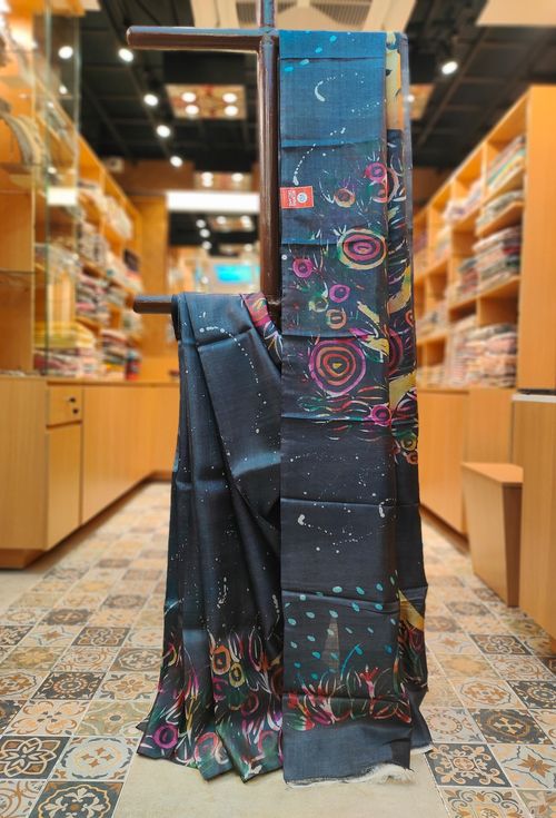 Black Colour Tussar Saree With Circle Hand Painted Motive