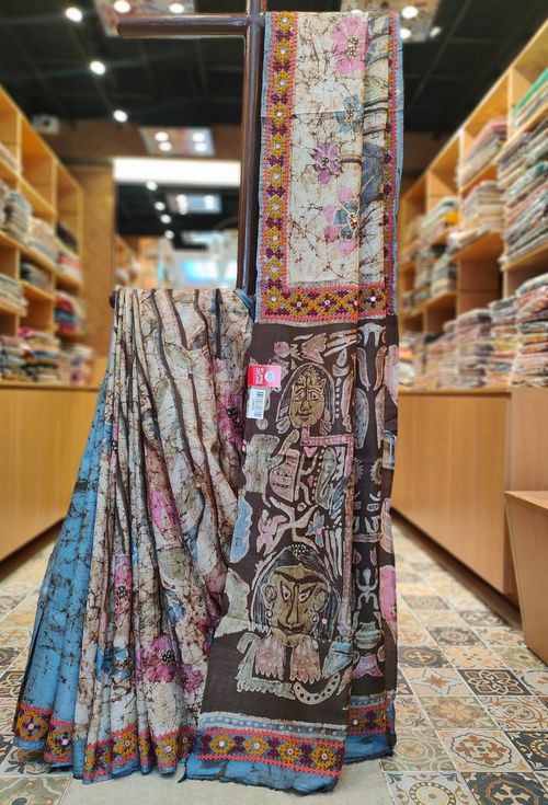 Hand Batik On Tussar With Gujrati Stitch
