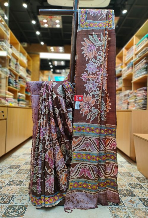 Brown Hand Wax Batik Saree With Floral Work On Body And Gujrati Stitch On Border And Anchaal With Mauve Colour Blose Piece On Tussar