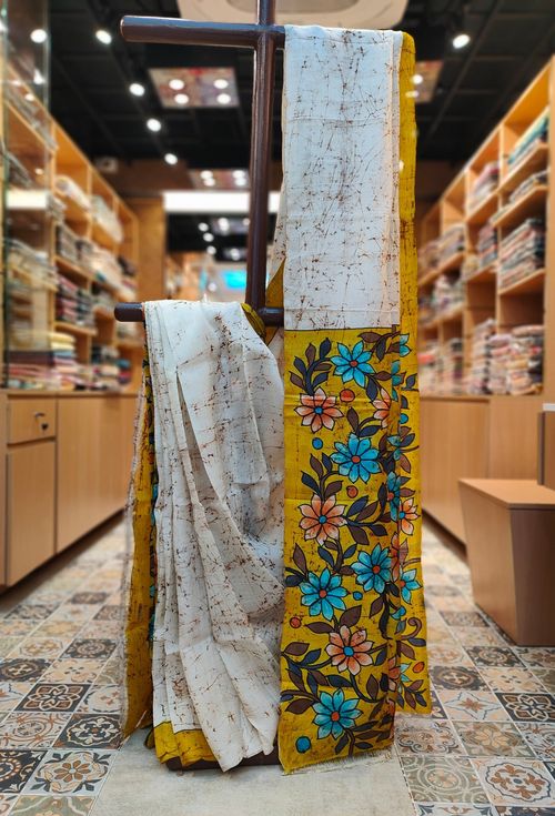White Colour Hannd Wax Batik With Body Crack And Gorgeous Floral Anchaal And Floral Blouse Piece