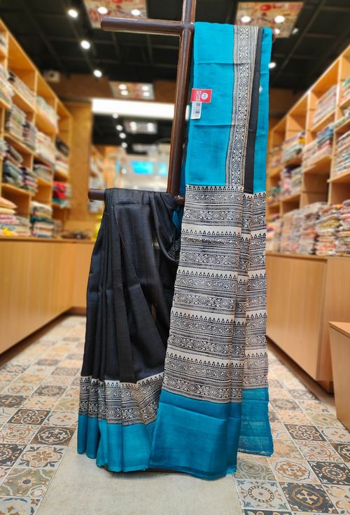 Black Colour Tussar Saree With Teal Blue Border And A Gorgeous Anchaal