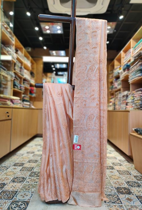 Peach Colour Chikankari Saree With Small Flower Motif In Body And Gorgeous Anchaal On Tussar